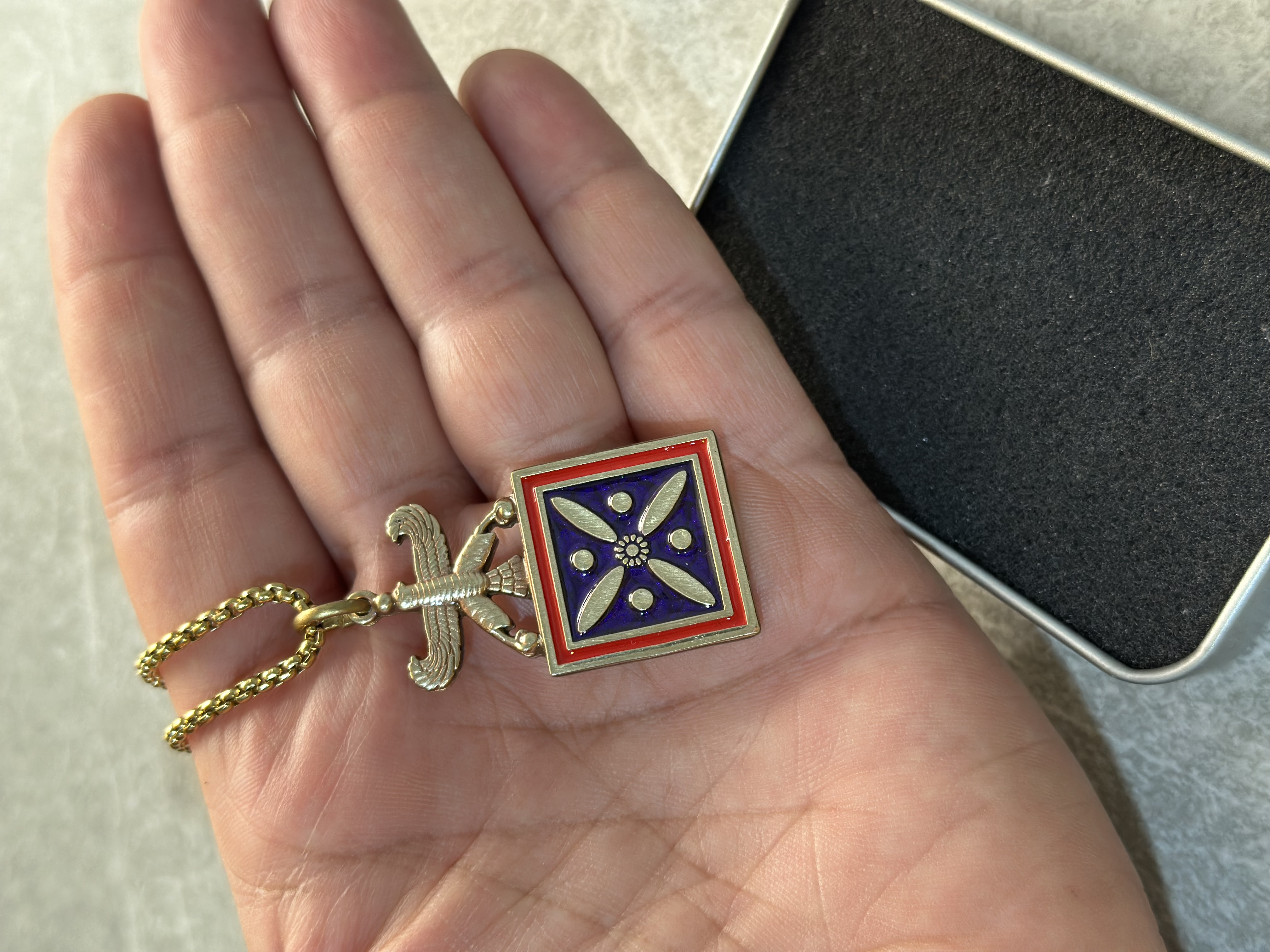 پلاک زیبا وبا اصالت درفش نبرد با زنجیر جنس اصلی با چهارسال ضمانت رنگی زنجیر ویتالی سه میل طول ۶۰سانت رنگ کاری شده با کیفیت بسیار بالا